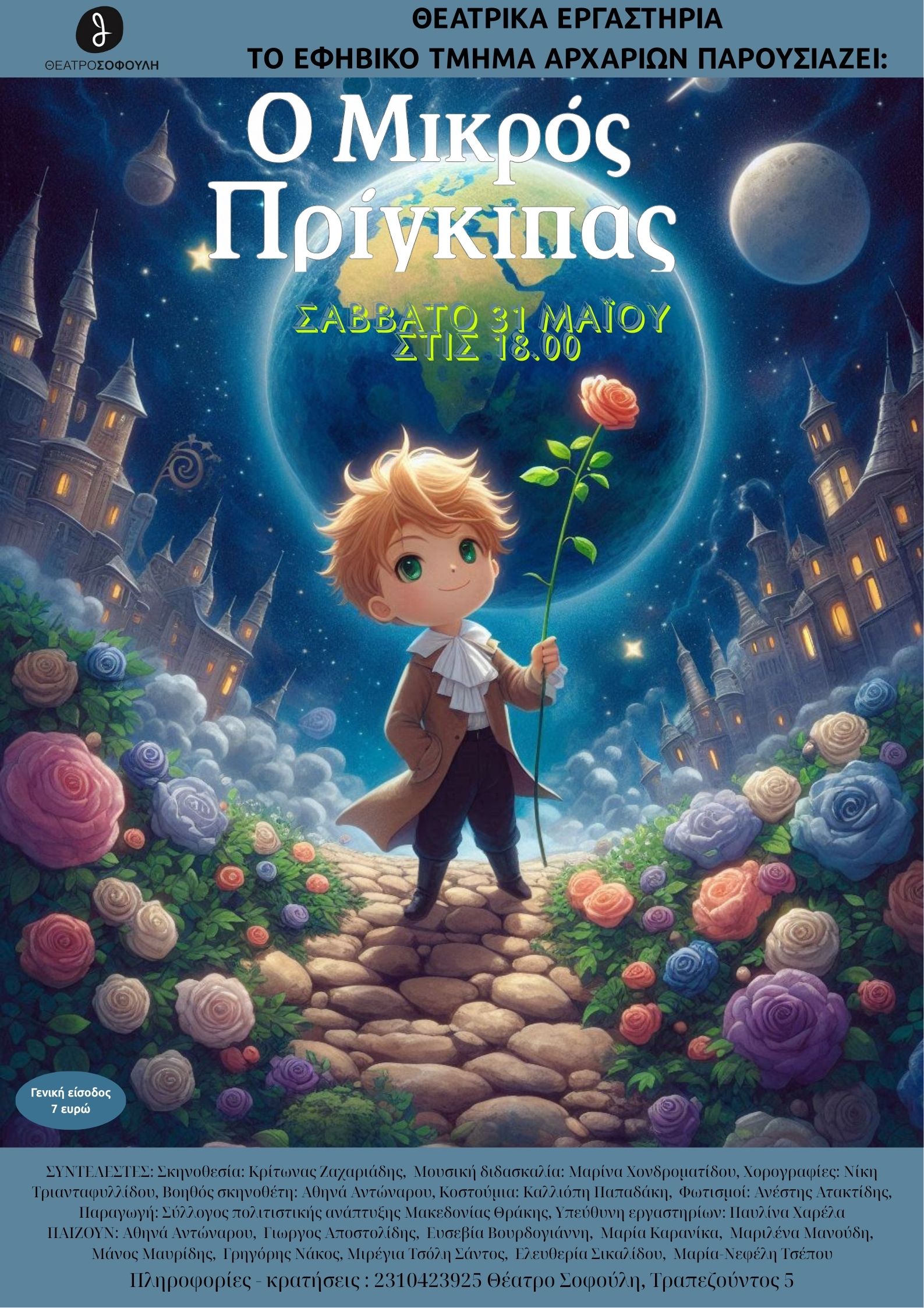 Ο μικρός πρίγκιπας θέλοντας να γνωρίσει και άλλους πλανήτες εκτός από το δικό του, αποφασίζει να αποχαιρετίσει ότι έχει και αγαπά, το τριαντάφυλλό του και να ξεκινήσει να ταξιδεύει. Επισκέπτεται καινούριους πλανήτες, γιατί θέλει να δει και να μάθει. Είναι όμορφος κι ευαίσθητος, αμείλικτος και διάφανος, περίεργος και απρόβλεπτος όπως μονάχα τα παιδιά μπορούν να είναι.