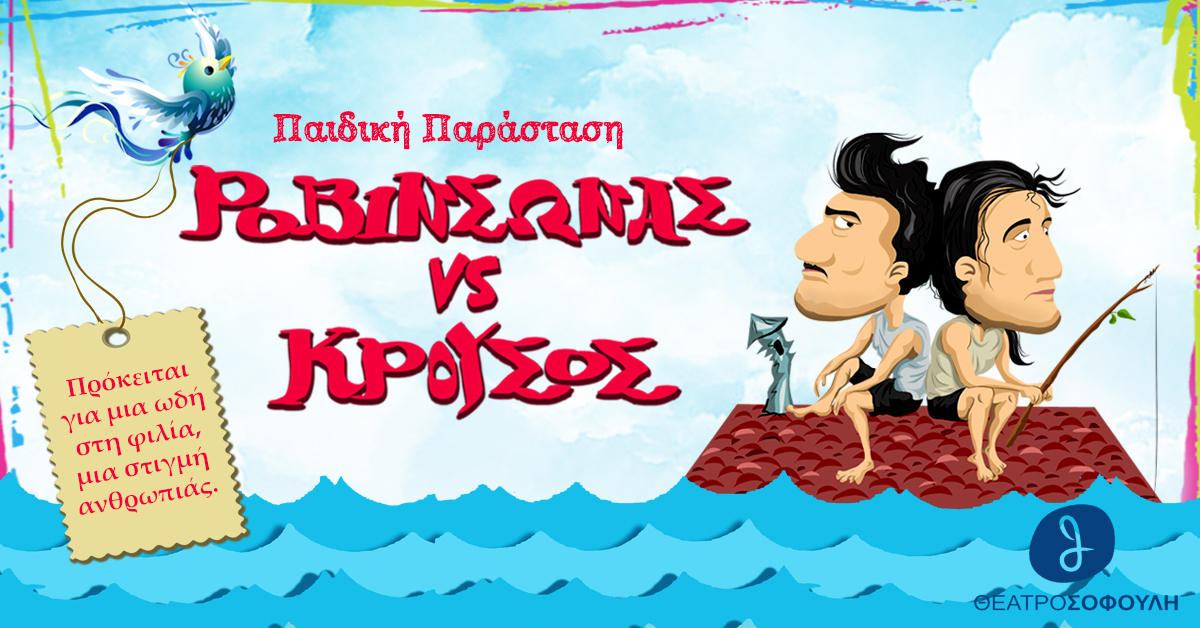 Η παράσταση «Ροβινσώνας VS Κρούσος» συστήνει στους μικρούς θεατές μια περιπετειώδη ιστορία δύο απίθανων ναυαγών σε έναν κόσμο, όπου η φαντασία, το χιούμορ και η ευρηματικότητα κυριαρχούν. Οι ήρωες μας βρίσκονται παγιδευμένοι σε μια στέγη περιτριγυρισμένη από ωκεανό εξαιτίας μιας πλημμύρας που έχει βυθίσει τα πάντα. Ο ένας μιλάει αρκετές ευρωπαϊκές γλώσσες, ενώ ο δεύτερος μια παράξενη, ακατάληπτη διάλεκτο ανατολίτικης προέλευσης. Οι δυο νέοι άντρες συναντιούνται τυχαία εκεί και αναγκάζονται να συνυπάρξουν καθώς η καταστροφή έχει επηρεάσει και τη Δύση και την Ανατολή. Ο ωκεανός είναι ο μόνος μάρτυρας των αγώνων τους να βρουν μια κοινή γλώσσα επικοινωνίας, ώστε αρχικά να εξασφαλίσουν την ανάγκη τους για επιβίωση και αργότερα να αναπολήσουν το παρελθόν τους και να αποφασίσουν για το μέλλον τους. Στην προσπάθεια τους να ανταπεξέλθουν, συνειδητοποιούν πως μόνο αν ξανά γίνουν παιδιά, θα καταφέρουν να συμπεριφερθούν ως ενήλικες.
