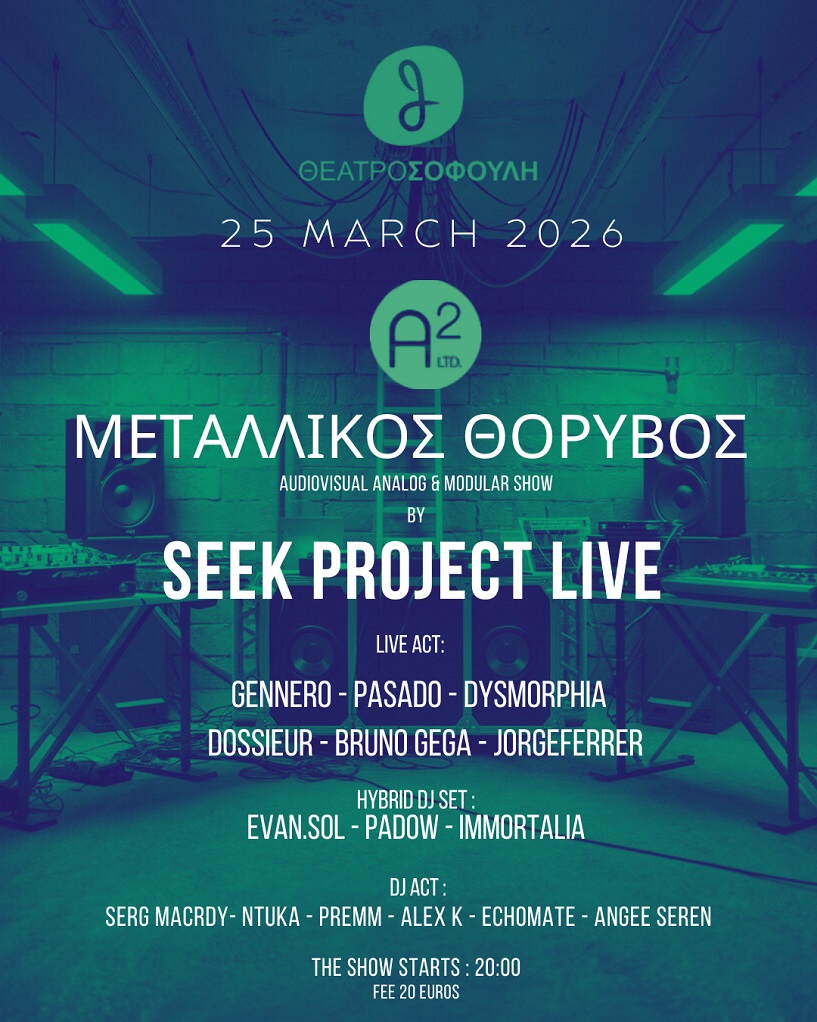 Η 25η Μαρτίου στο θέατρο Σοφούλη έχει γίνει θεσμός τα τελευταία χρόνια καθώς για ακόμα μια χρονια ή ηλεκτρονική μπάντα SEEK PROJECT θα παρουσιάσει εξοπλισμούς τελευταίας τεχνολογίας – απίστευτα χαοτικά visuals αλλά και ένα custom analog modular set up όπου θα θέσουν τον πήχη πολύ ψηλά καθώς θα παρουσιαστεί για πρώτη φορά κάτι τέτοιο στην Ελλάδα.