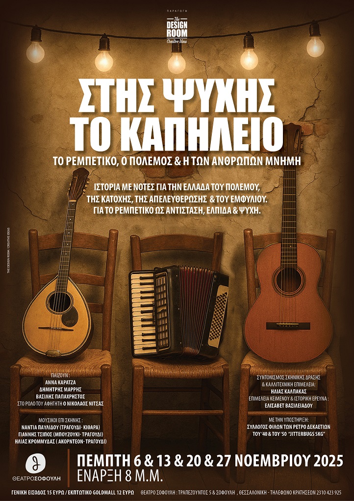 Ένα συγκλονιστικό story – telling, ένα νοσταλγικό μουσικοθεατρικό «ταξίδι» μέσα από τις νότες, τις σκιές και τις σιωπές μιας Ελλάδας που πάλεψε, αγάπησε και πόνεσε. Η αφήγηση παρακολουθεί τη ζωή της κυρά-Σουλτάνας, του Τάκη του Λευτέρη και των μουσικών του μαγαζιού, του Βρασίδα, της Κούλας και του Μήτσου, από την αυγή του Ελληνοϊταλικού Πολέμου έως την Απελευθέρωση και τον Εμφύλιο. Το «Καπηλειό του Μπάρμπα – Στέλιου» γίνεται η φωνή του λαού. Το ρεμπέτικο, άλλοτε μοιρολόι, άλλοτε κραυγή, συνοδεύει στιγμές πόνου, αντίστασης, συντροφικότητας και λαχτάρας για ειρήνη. Στην καρδιά μιας παλιάς συνοικίας της Αθήνας, σ’ αυτό το μικρό καπηλειό, τρία όργανα – το μπουζούκι, το ακορντεόν και η κιθάρα – γίνονται οι αφηγητές μιας εποχής. Είναι οι φωνές μιας γενιάς που αρνήθηκε να σωπάσει. Το ρεμπέτικο, άλλοτε εξόριστο και διωγμένο, γίνεται κραυγή αντίστασης, παρηγοριά στη θλίψη, σύνθημα ελευθερίας. Μια παράσταση γεμάτη συγκίνηση, ιστορία και ζωντανή μουσική που μας θυμίζει πως ακόμη και στις πιο σκοτεινές εποχές, οι χορδές ενός τραγουδιού μπορούν να γίνουν η πιο δυνατή φλόγα.